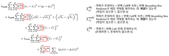 - 첫 번째 식 : Bounding Box의 중심 좌표 x, y에 대한 loss