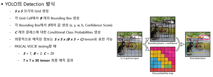 각 Grid Cell은 오직 B개의 Bounding Box를 예측하고 하나의 클래스만을 갖을 수 있다.