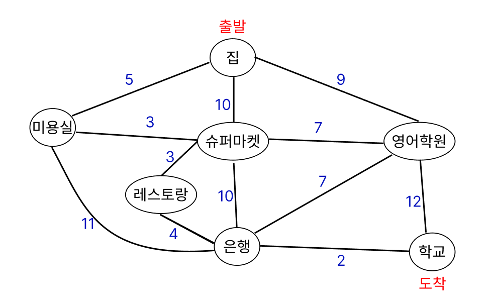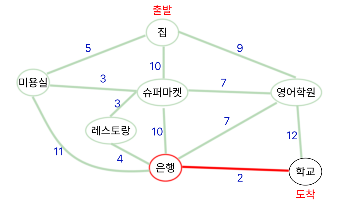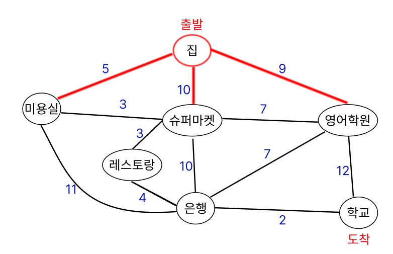 집에서 출발해 학교까지 도착하는 최단 경로를 구하려고 한다.