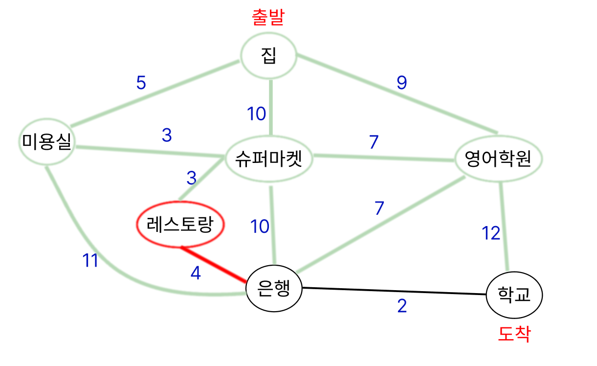 각 노드의 거리값은 '레스토랑' : 3, '영어학원' : 7, '은행' : 10 이다.