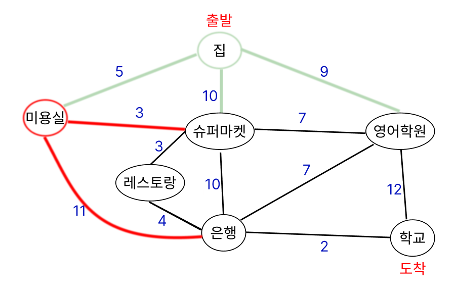 여기에 미용실 부터 이웃노드 까지의 거리값을 더해주면 된다.