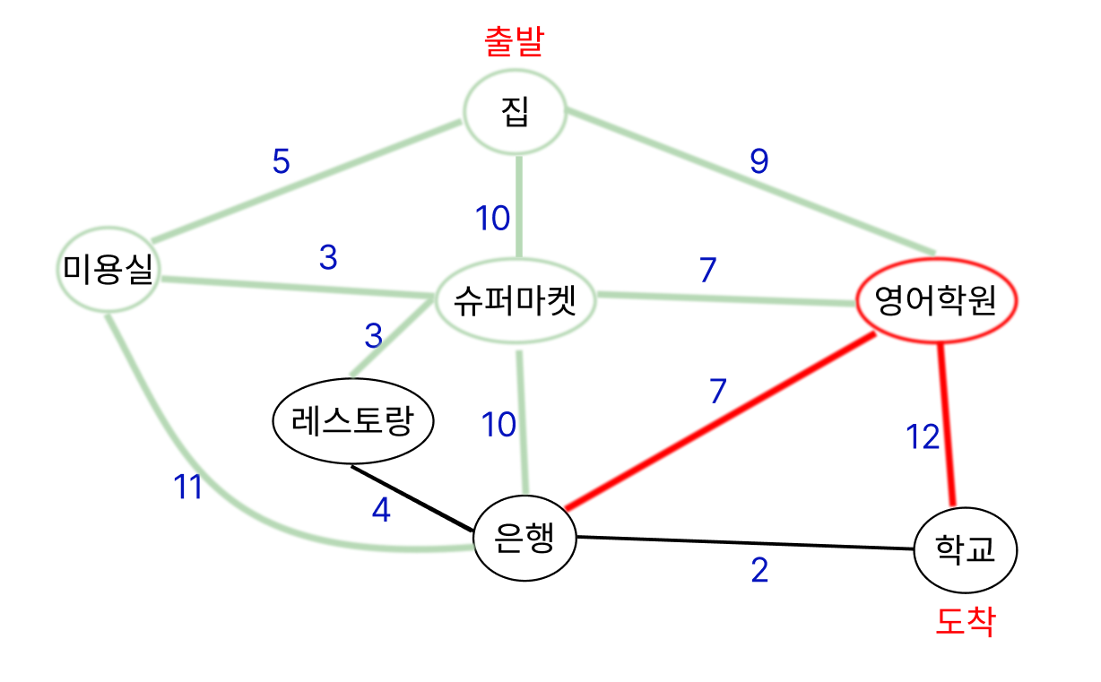 여기에 영어학원부터 이웃노드 까지의 거리값을 더해주면 된다.