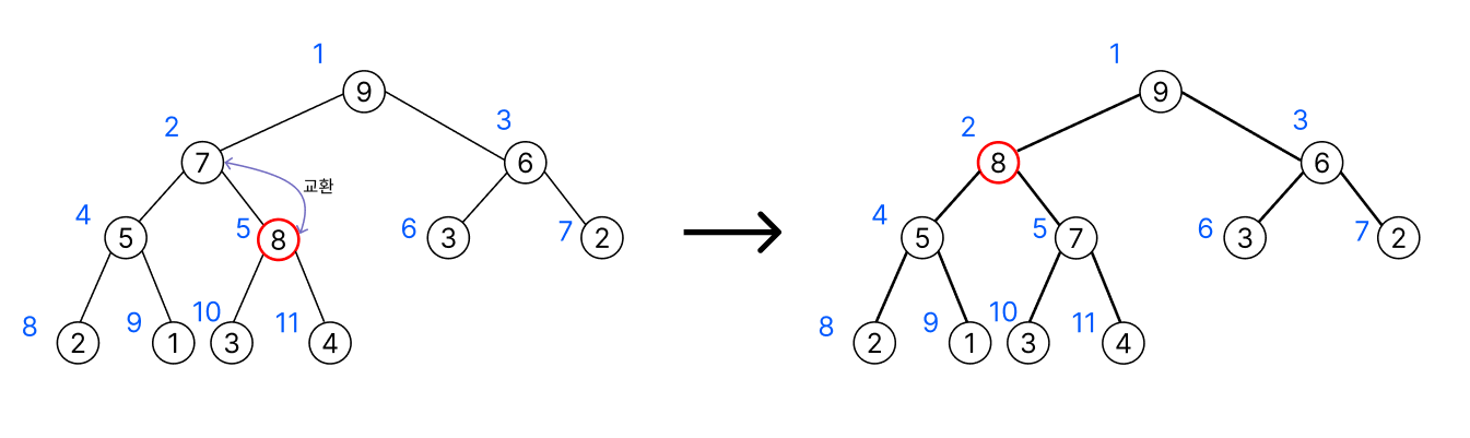 이후, 새로운 노드를 부모 노드들과 교환해서 힙의 성질을 만족시킨다.