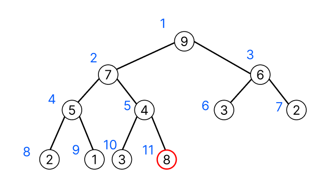 4) 부모노드 9 > 삽입노드 8 이므로 교환 안함.