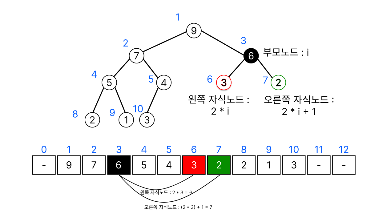 예를 들어, 루트 노드(인덱스 1)의 왼쪽 자식은 2 * 1 = 2 번, 오른쪽 자식은 2 * 1 + 1 =3번 인덱스에 위치하게 된다.