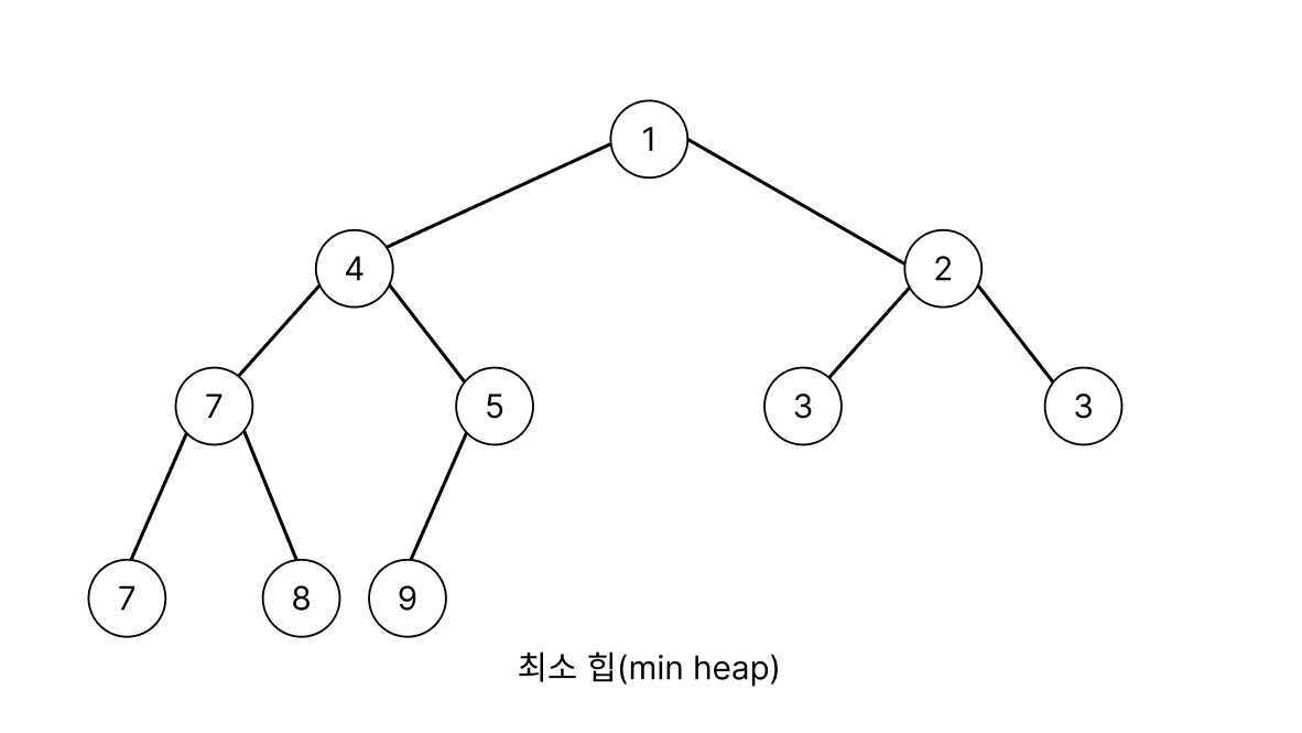 - 최소 힙(min heap) : 부모 노드의 키 값이 자식 노드보다 작은 구조