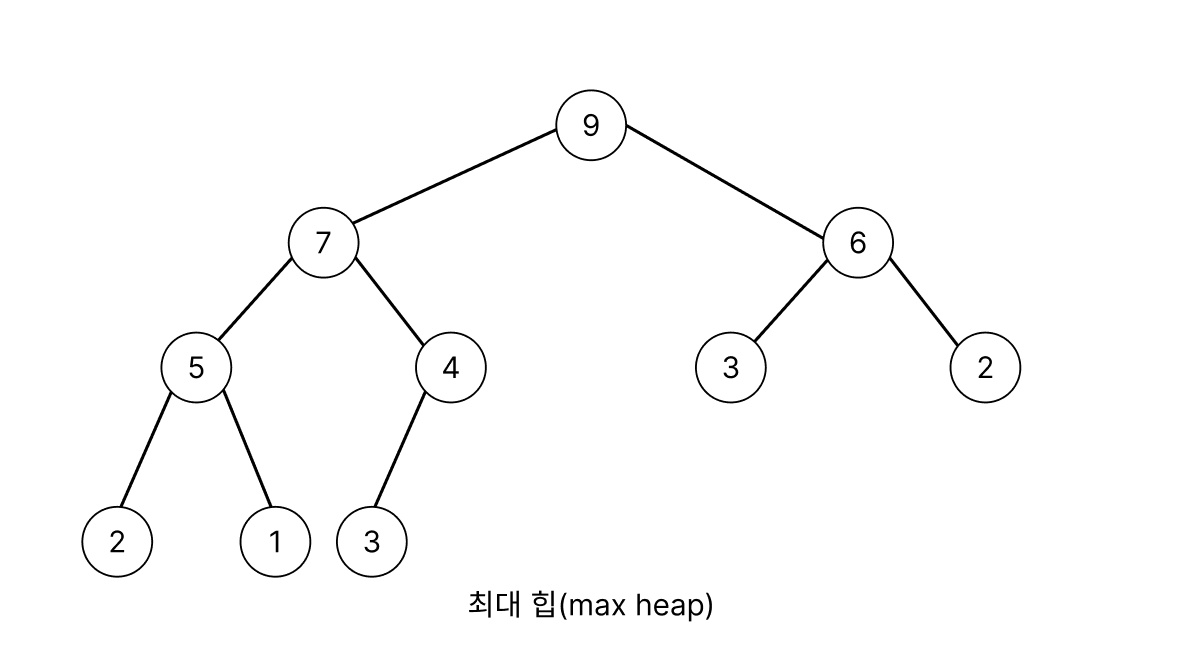 - 최대 힙(max heap) : 부모 노드의 키값이 자식 노드보다 큰 구조